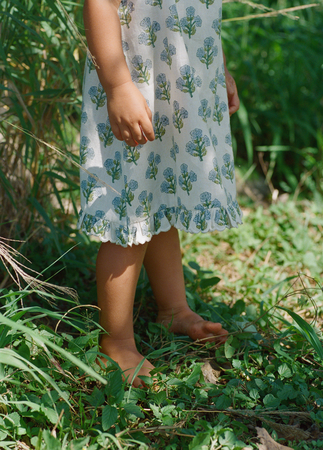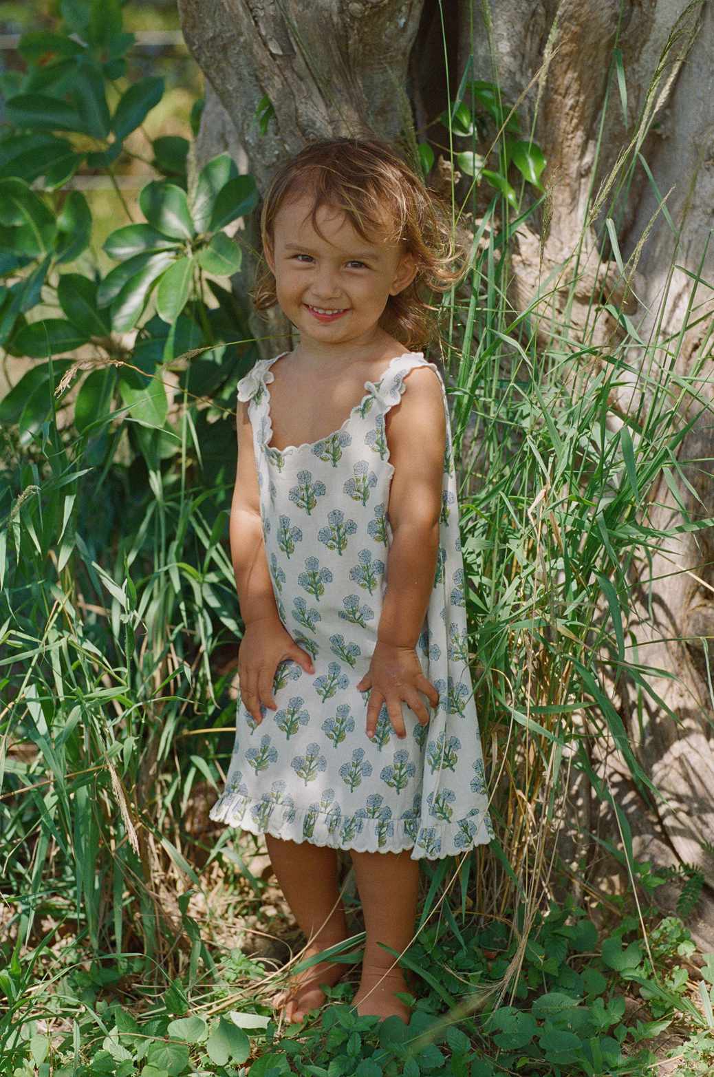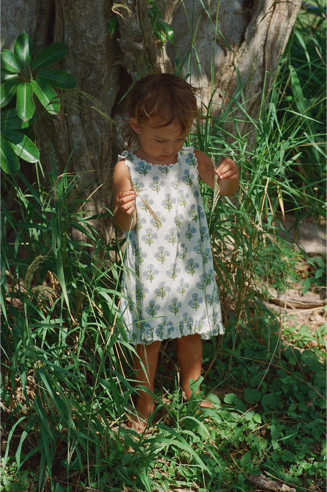 Made from soft cotton flex, the Lilou Dress combines comfort with playful details. Functional shell buttons top the straps, while embroidered scallop edges adorn the neckline and straps. The hem features a dainty ruffle with matching scallop embroidery, creating an effortless style.