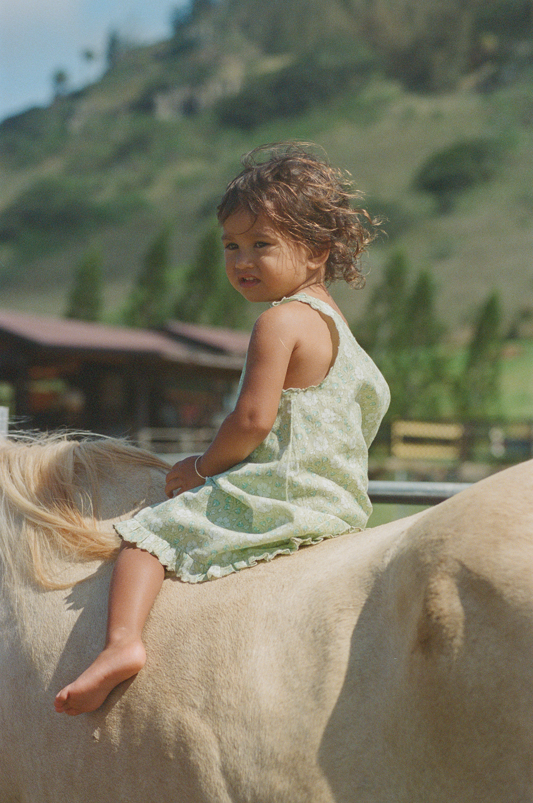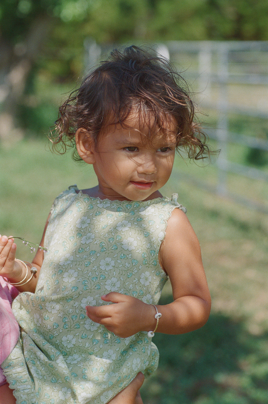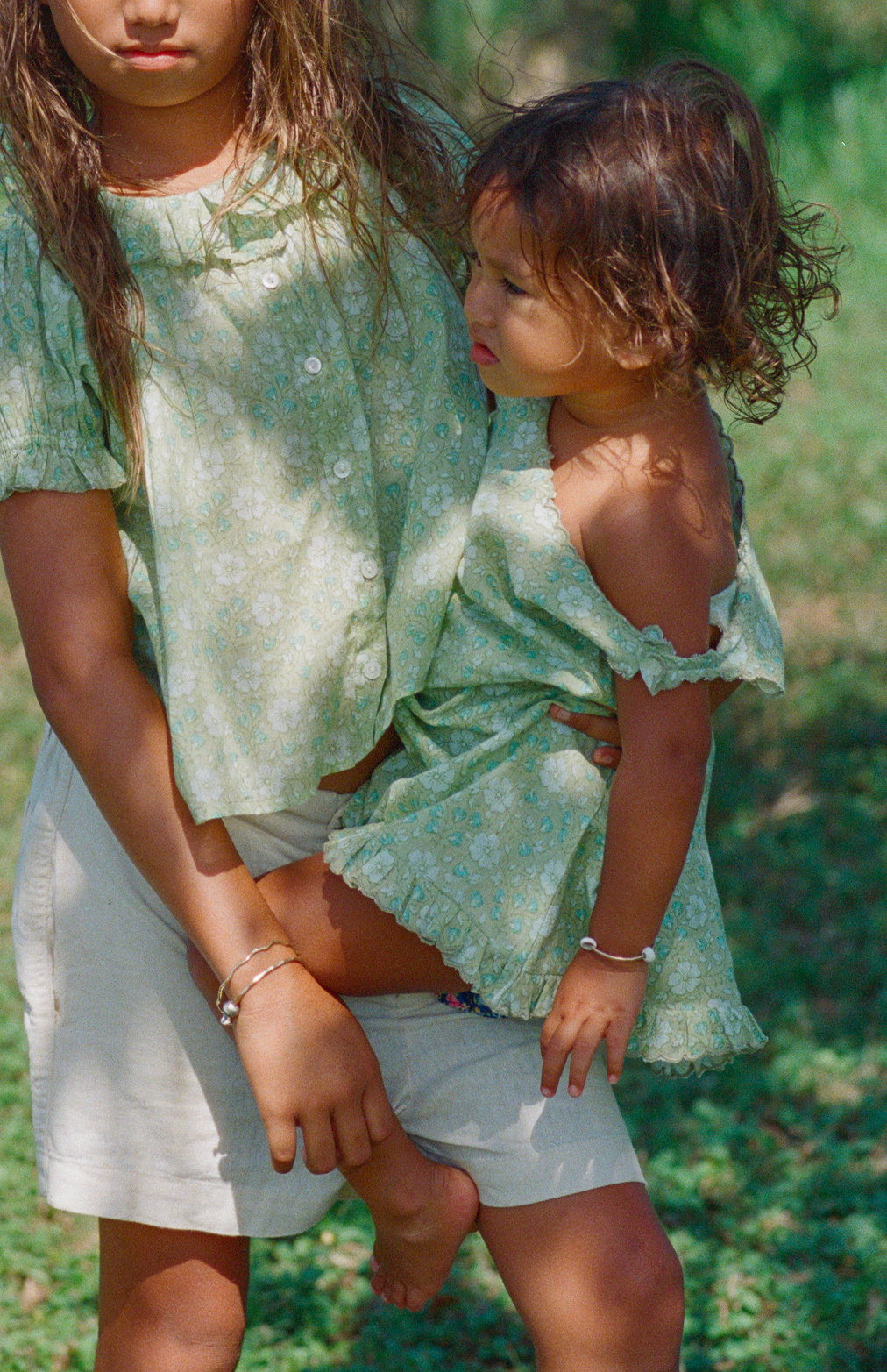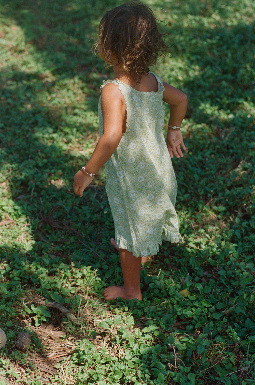 Made from soft cotton flex, the Lilou Dress combines comfort with playful details. Functional shell buttons top the straps, while embroidered scallop edges adorn the neckline and straps. The hem features a dainty ruffle with matching scallop embroidery, creating an effortless style.