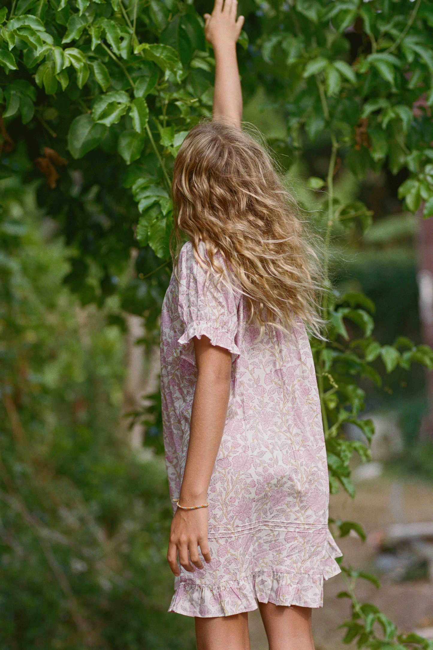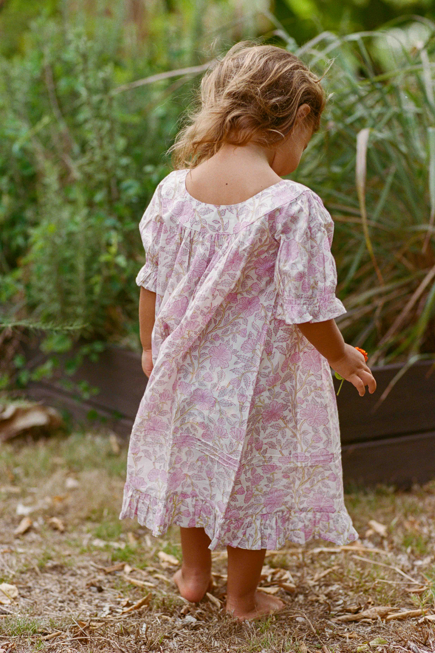 The Coral Dress is made from soft cotton cambric, with a scoop neckline and puff sleeves detailed with smocking at the cuff and a delicate ruffle. The hem is accented with a ruffle and pintuck detailing for added charm.