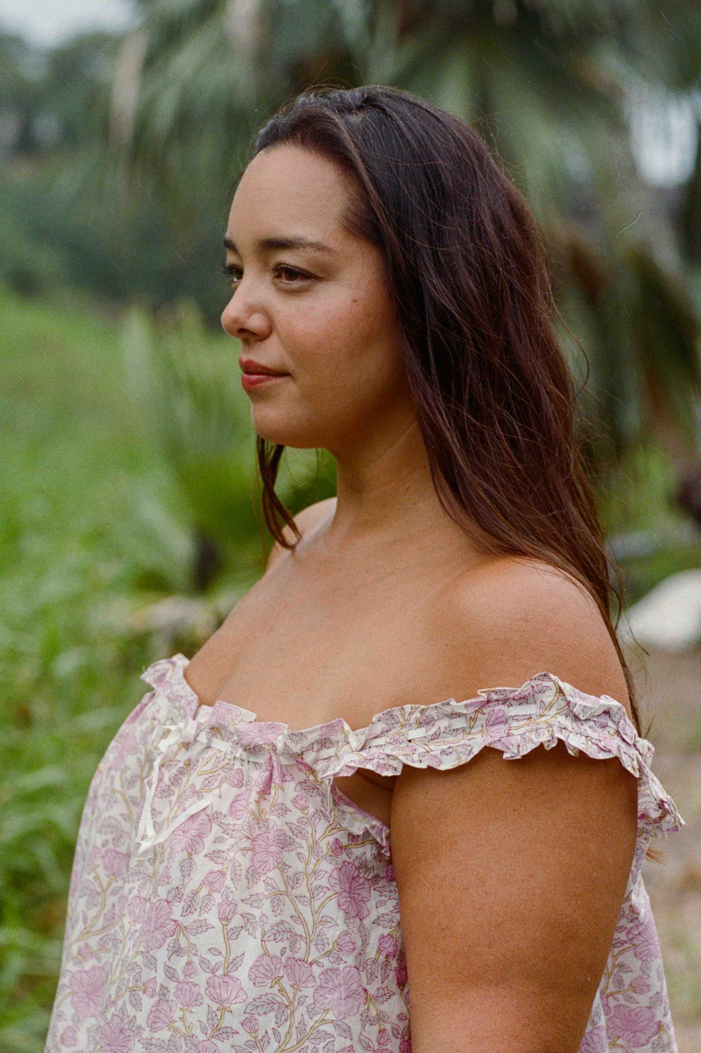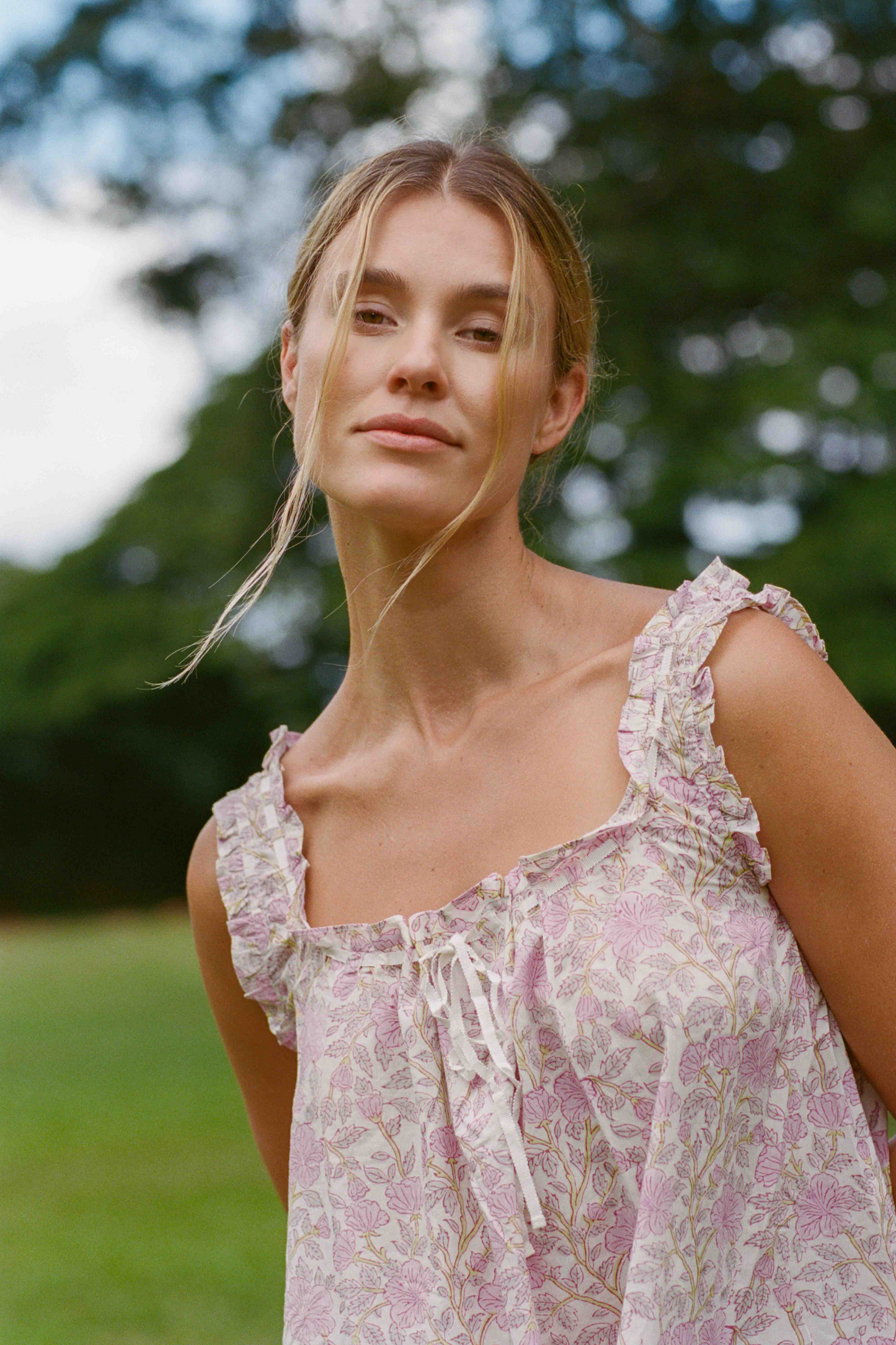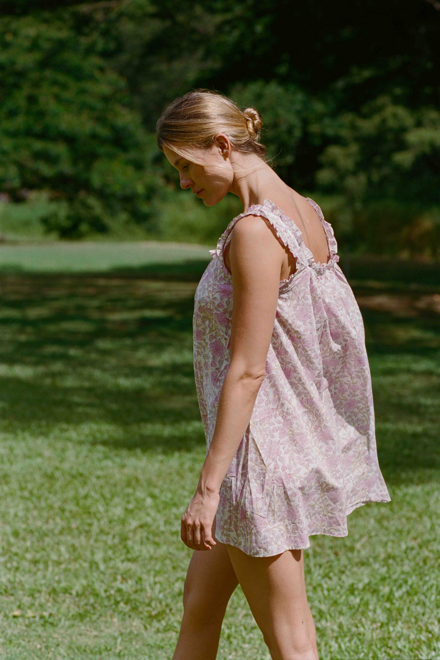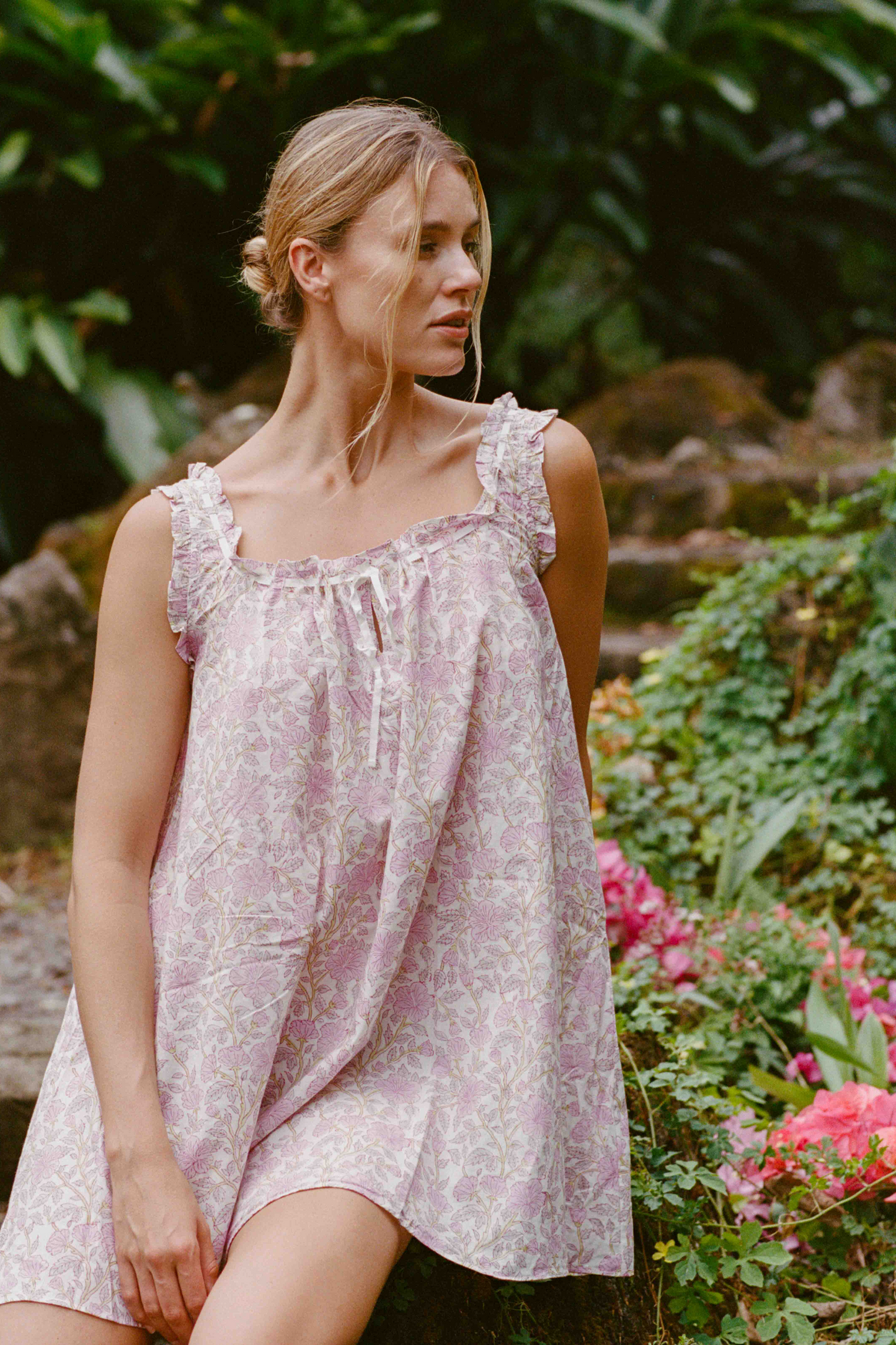 Made from lightweight cotton cambric, the Kanani Dress drapes in a breezy silhouette with gentle flounce. Straps are trimmed with petite ruffles and feature delicate grosgrain ribbon detailing for an adjustable neckline. A small front keyhole adds a subtle finishing touch.